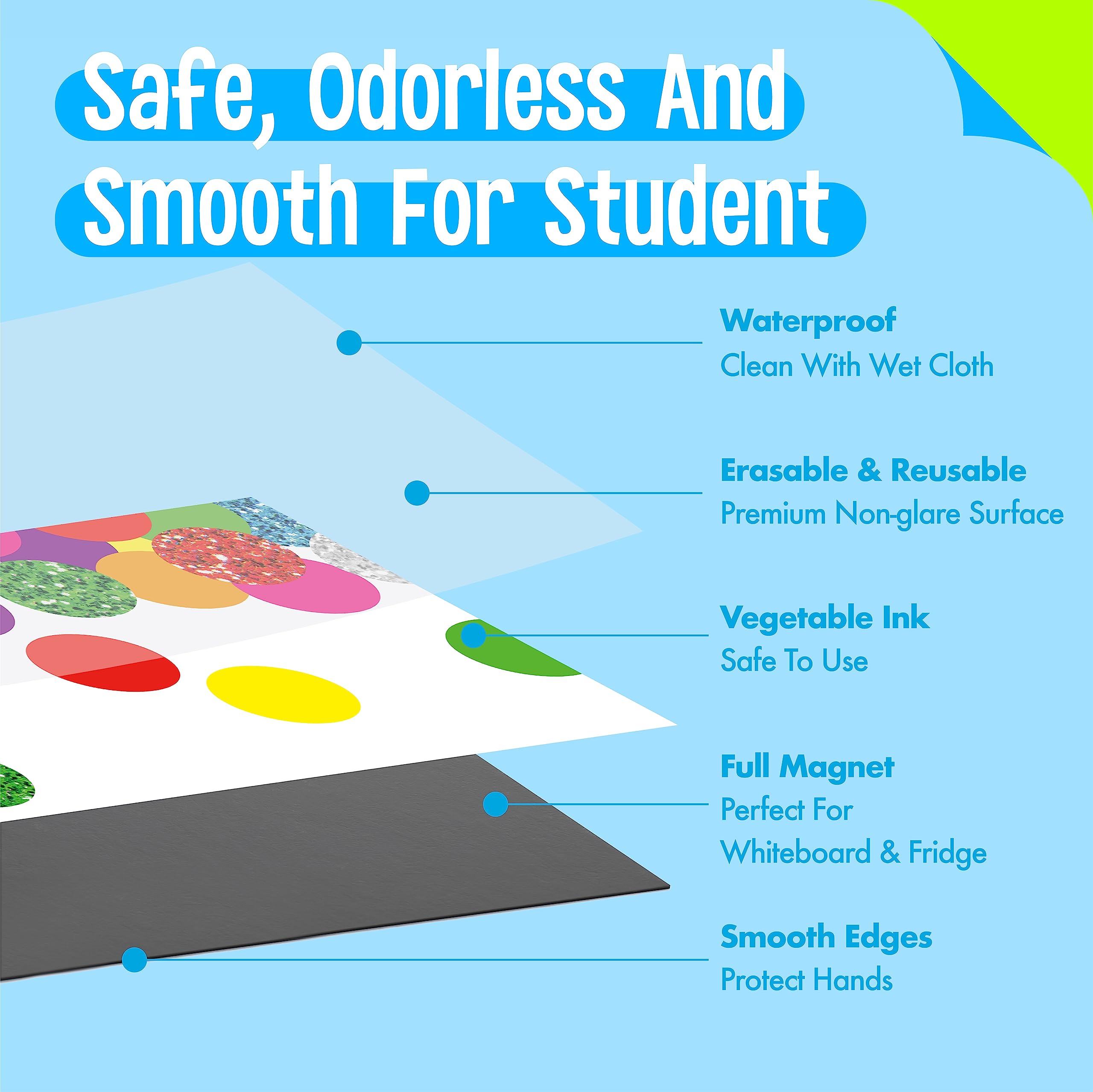 - Premium Material: Made of high quality paper materials, coated with PET film, durable and sturdy. The colorful magnetic strips are waterproof and scratch-resistant, making them perfect for daily use in the classroom or at home. Fully backed with a large magnet, stick firmly to whiteboards or other magnetic and smooth surfaces, convenient and easy to move.