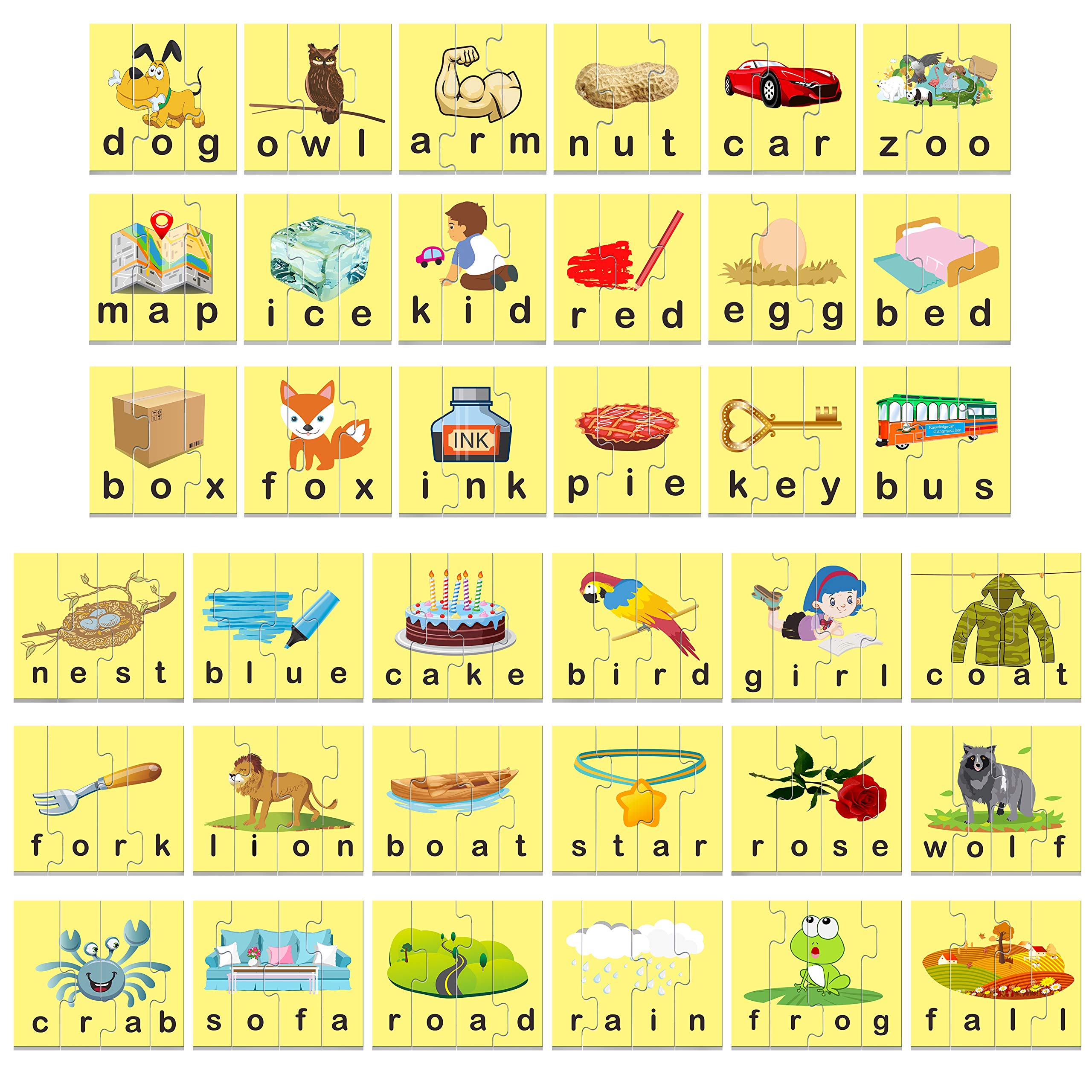 - 72 Words: in 36 blocks, double sided with different background color for easy identification. Each word comes with its matching image for kids to identify and gain their relationship though the play. Furthermore, puzzle pieces belong to different words will not match so the kids would find the mistake and fix it.