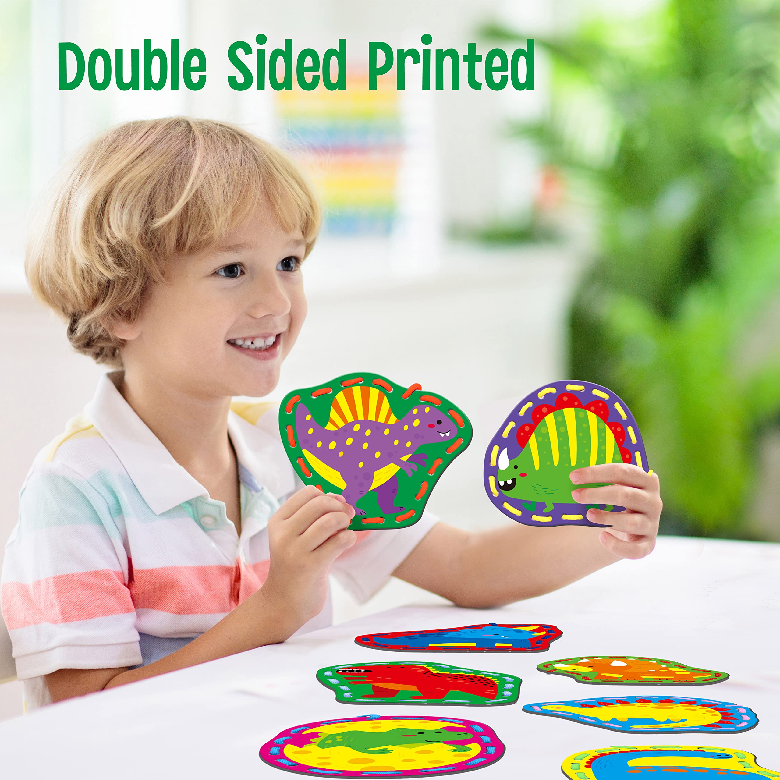 - Cute Animal Patterns: The pattern covers diverse adorable dinosaurs, like stegosaurus, triceratops, Diplodocus and other lovely dinosaurs. The patterns on cards are colorful, big and vibrant. The holes are clearly cut and easy for preschoolers to work with. The strings are easy for children to use and fit into the holes easily.